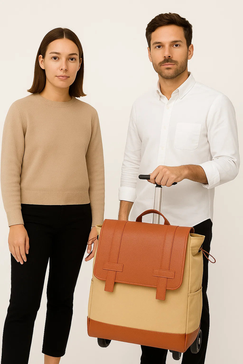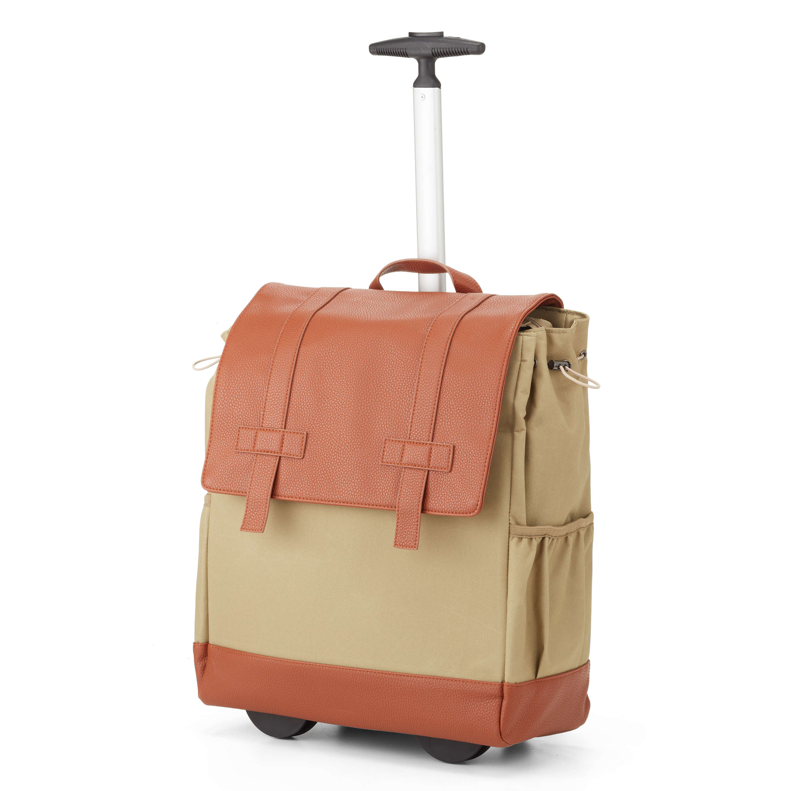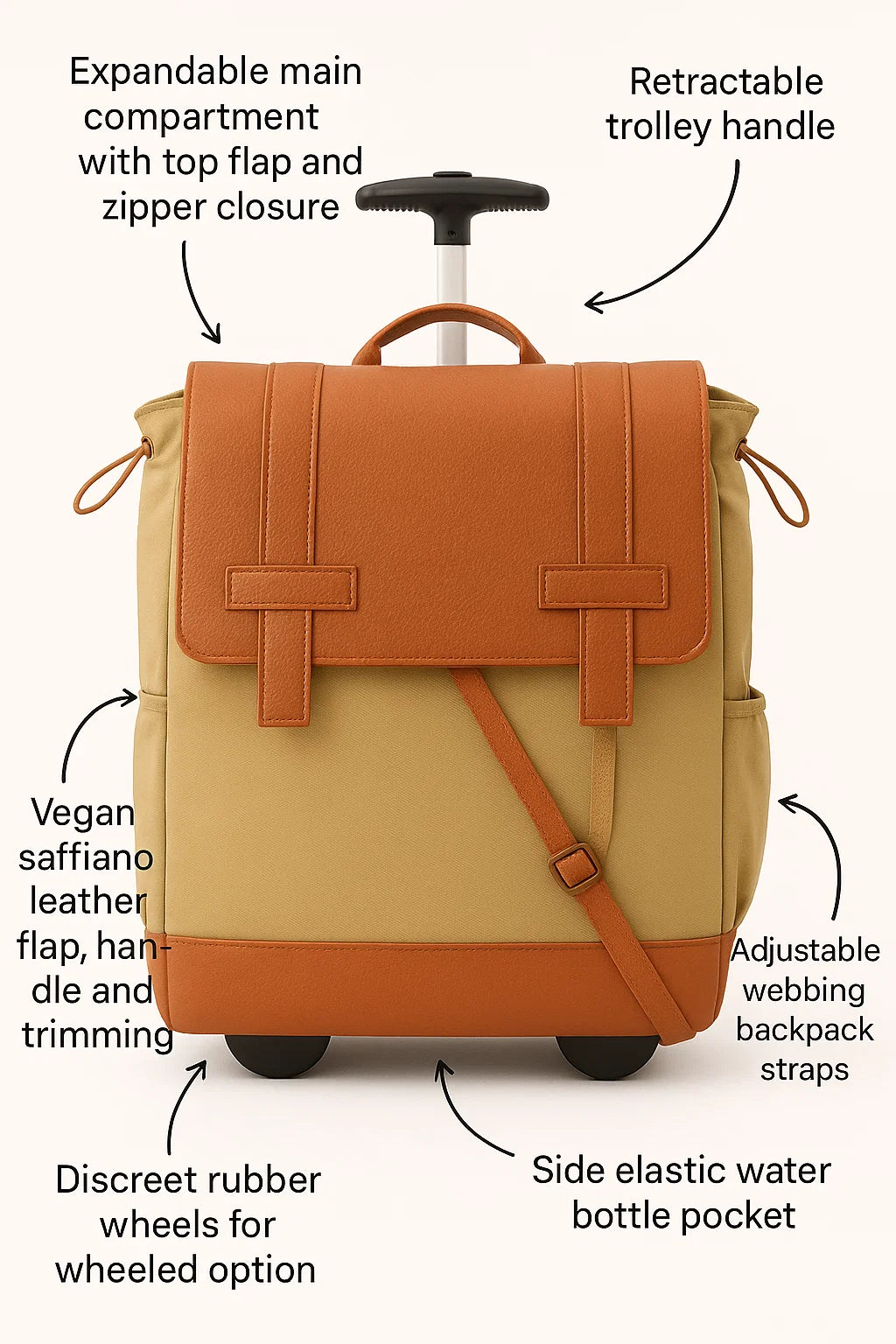 Francine’s Wheels Up convertible roller backpack takes you up, up & away; Internationally bound or to the office. The main compartment expands to fill your business-day needs and overnight plans. The vegan leather flap fashionably keeps your items safe. Elastic bands on each side expand to your needs, carrying it all with the ease of wheels: work devices, gym stuff and all your life essentials.
