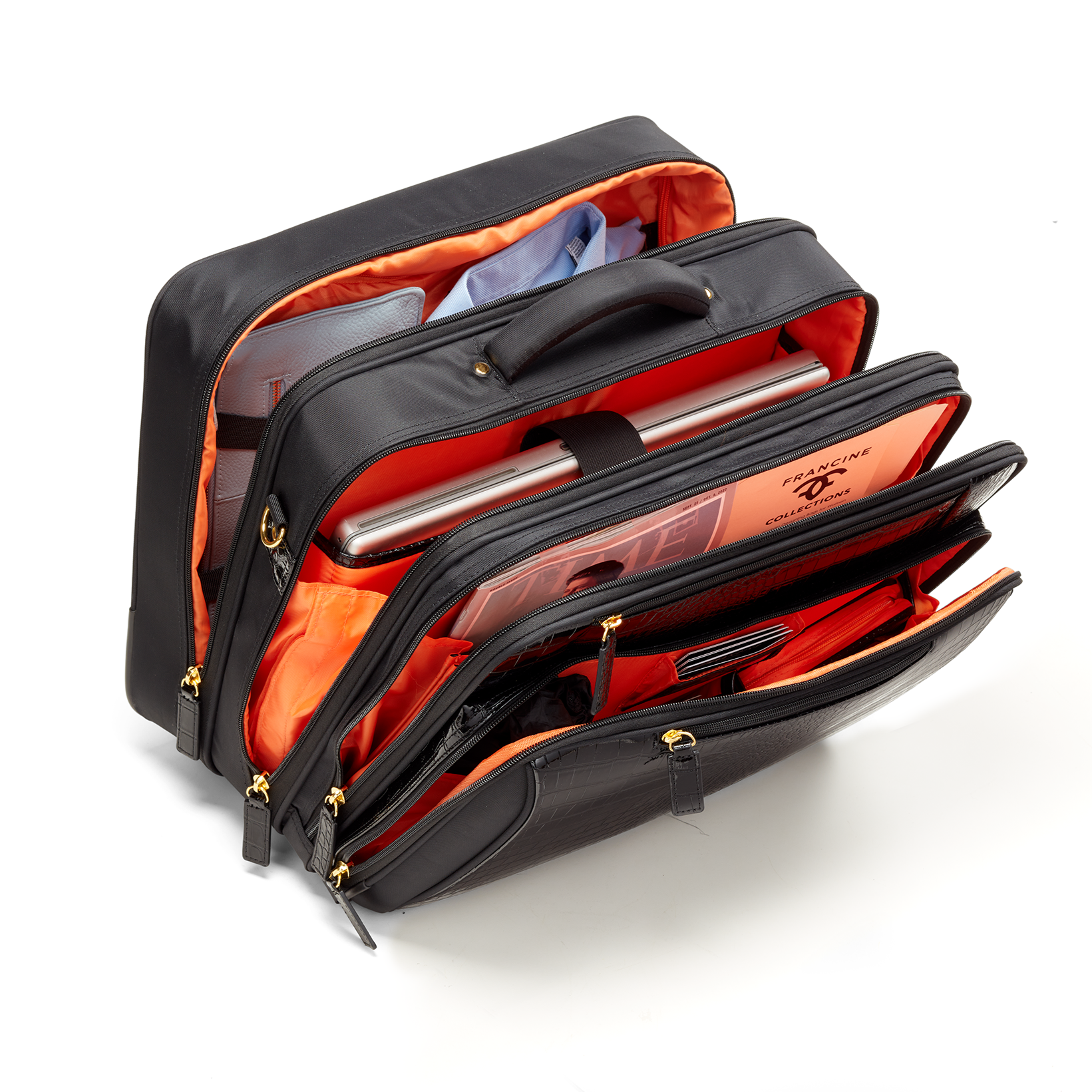 - Four zippered compartments for mobile accessories, file folders, laptops, & clothing