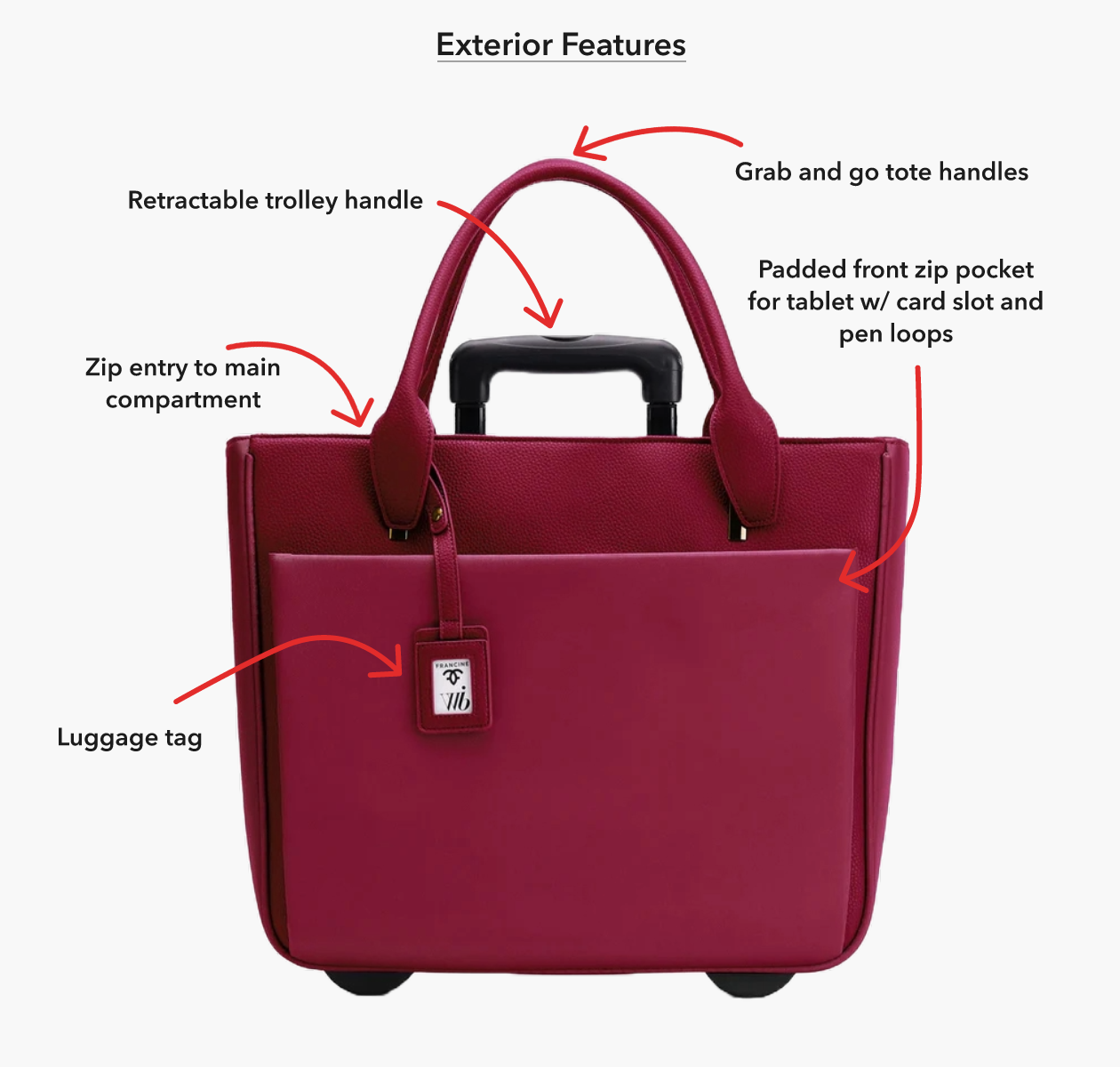 Transport your business travel essentials comfortably and stylishly in Francine’s Florence Roller Tote. Rolling into the office or onto a plane, our wheeled laptop tote makes the best companion for your 24 hour day. Available in burgundy, providing you with an elegant and eye-catching accessory to accompany you on your daily or international adventures. Women Want Wheels, and Francine’s laptop roller tote gives you just that and more.