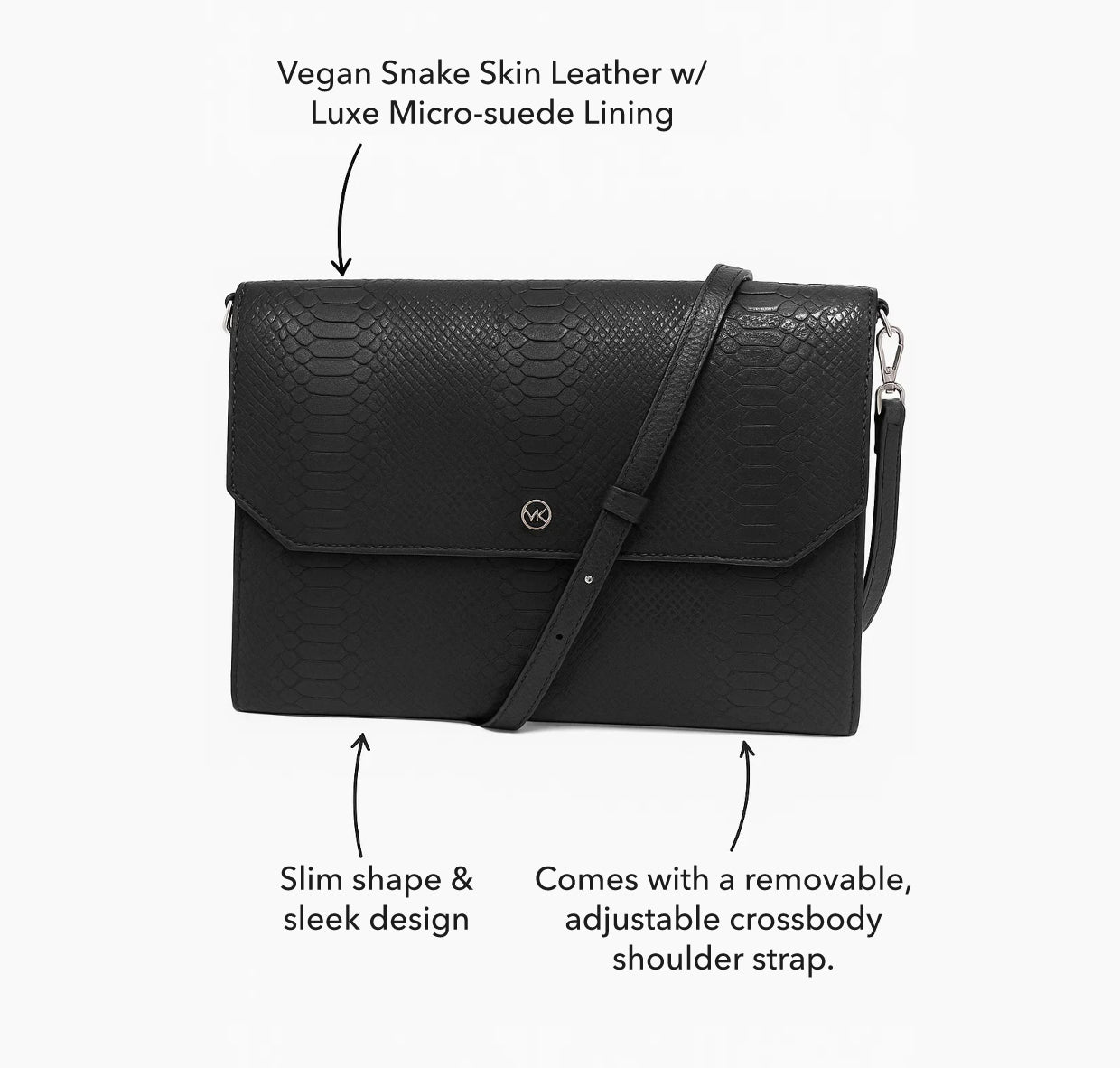 - Material: Vegan Snake Skin Leather w/ Luxe Micro-suede Lining