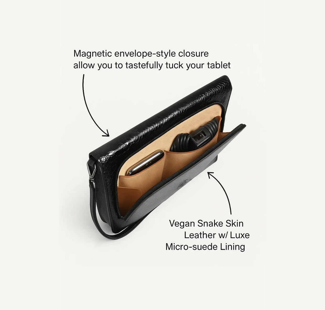 - Luxe micro-suede lining, protective shell, and magnetic envelope-style closure allow you to tastefully tuck your tablet