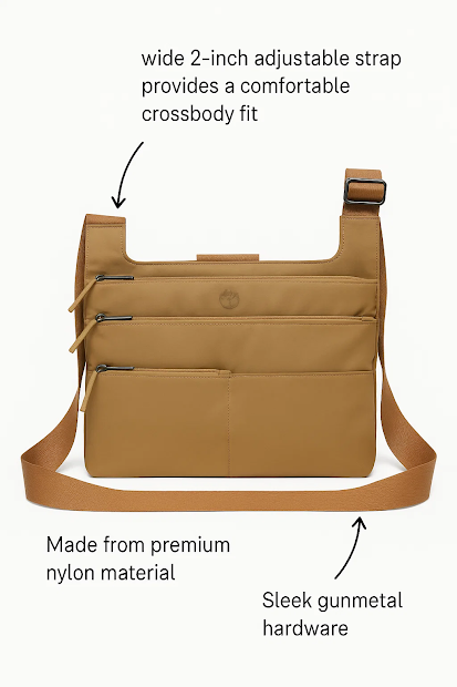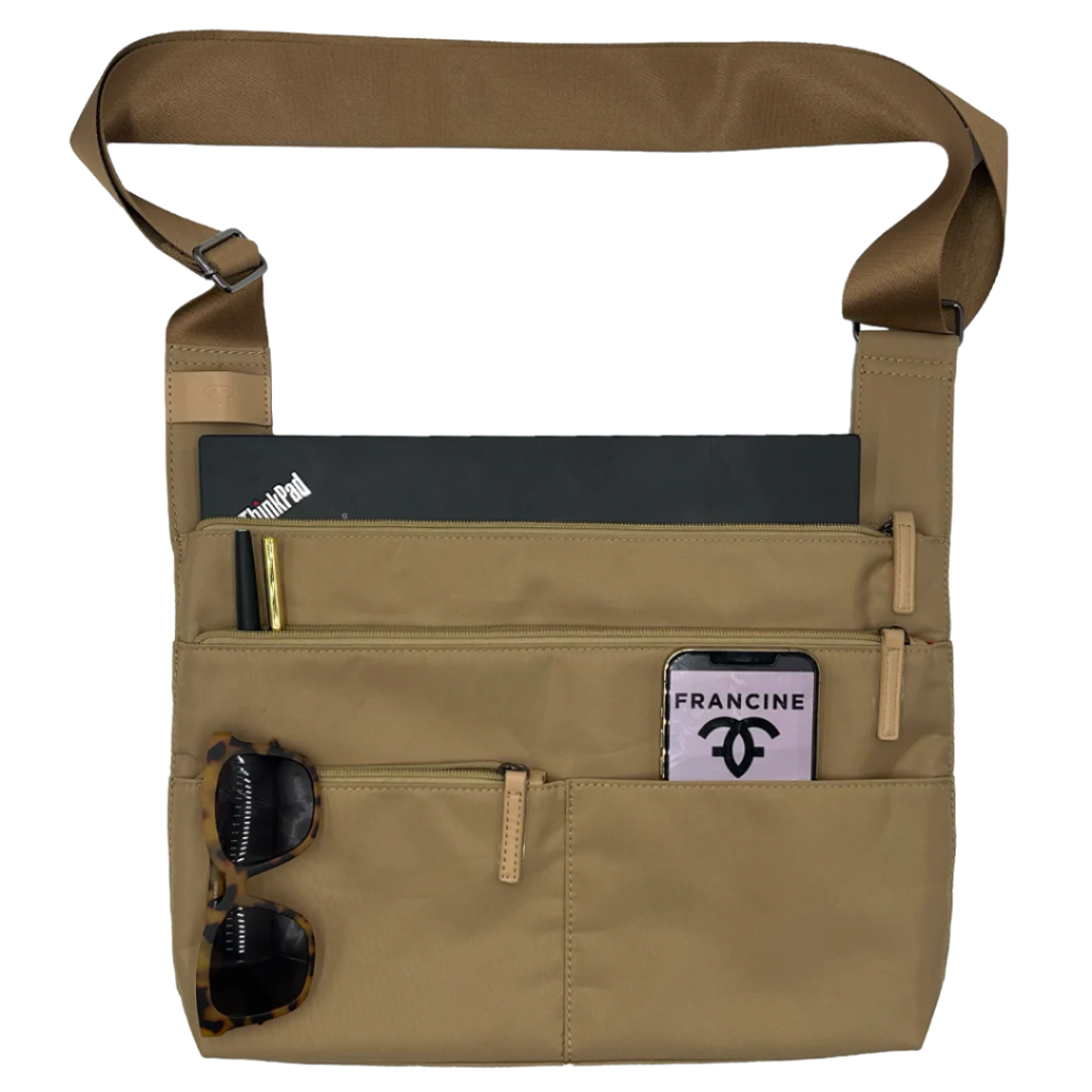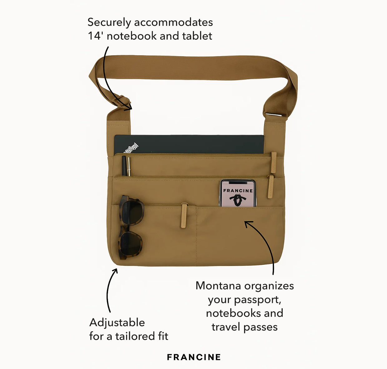 Montanas crossbody bag features a total of 5 pockets, including a device-safe compartment for your laptop or tablet, and pockets for your passport, notebook, travel pass, ensuring all your essentials are neatly stored and accessible