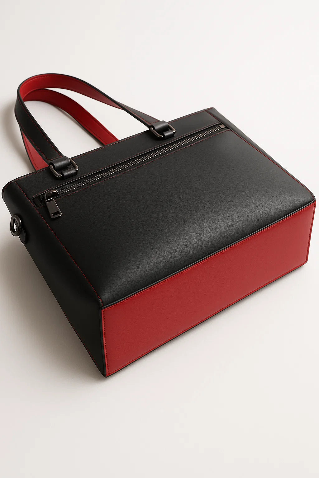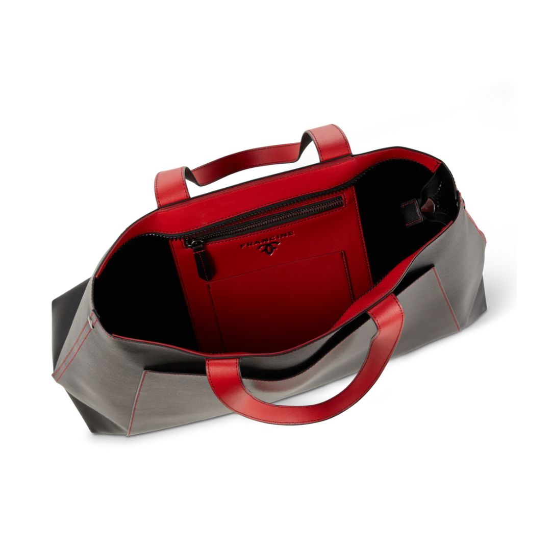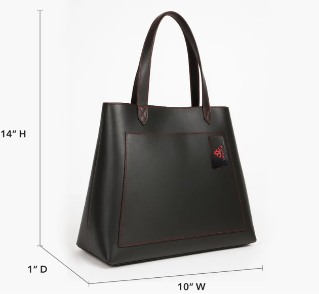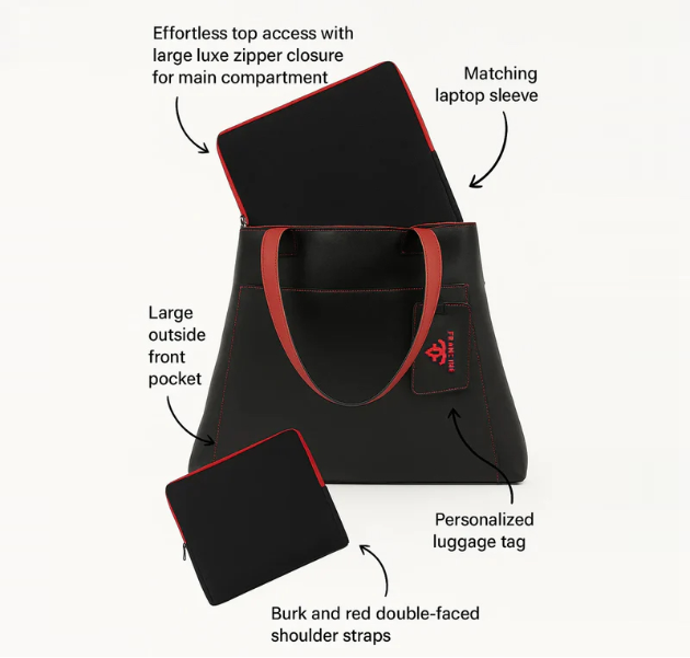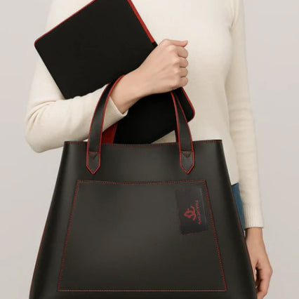 A black leather laptop tote is a classic handbag design you’ve seen before, but we’ve added a twist that elevates the appearance and functionality. The Rouge Noir Tote with a zip-up laptop sleeve is Francine’s distinctive carryall bag—a true fashion statement that combines functionality and elegance. The sculpted tapered silhouette features elegant scarlet red contrast stitching, exuding sophistication and confidence with a powerful black and red color combination. The ample storage room and removable laptop sleeve make this tote perfect for busy professionals on the go. The Rouge Noir Tote’s large exterior computer file pocket provides easy and quick access to essentials, from documents to sunglasses. Inside, you’ll find a zippered accessory pocket for your important personal items like your wallet, phone, and IDs. This vegan Rouge Noir Tote with an accompanying laptop sleeve is a wardrobe must-have!