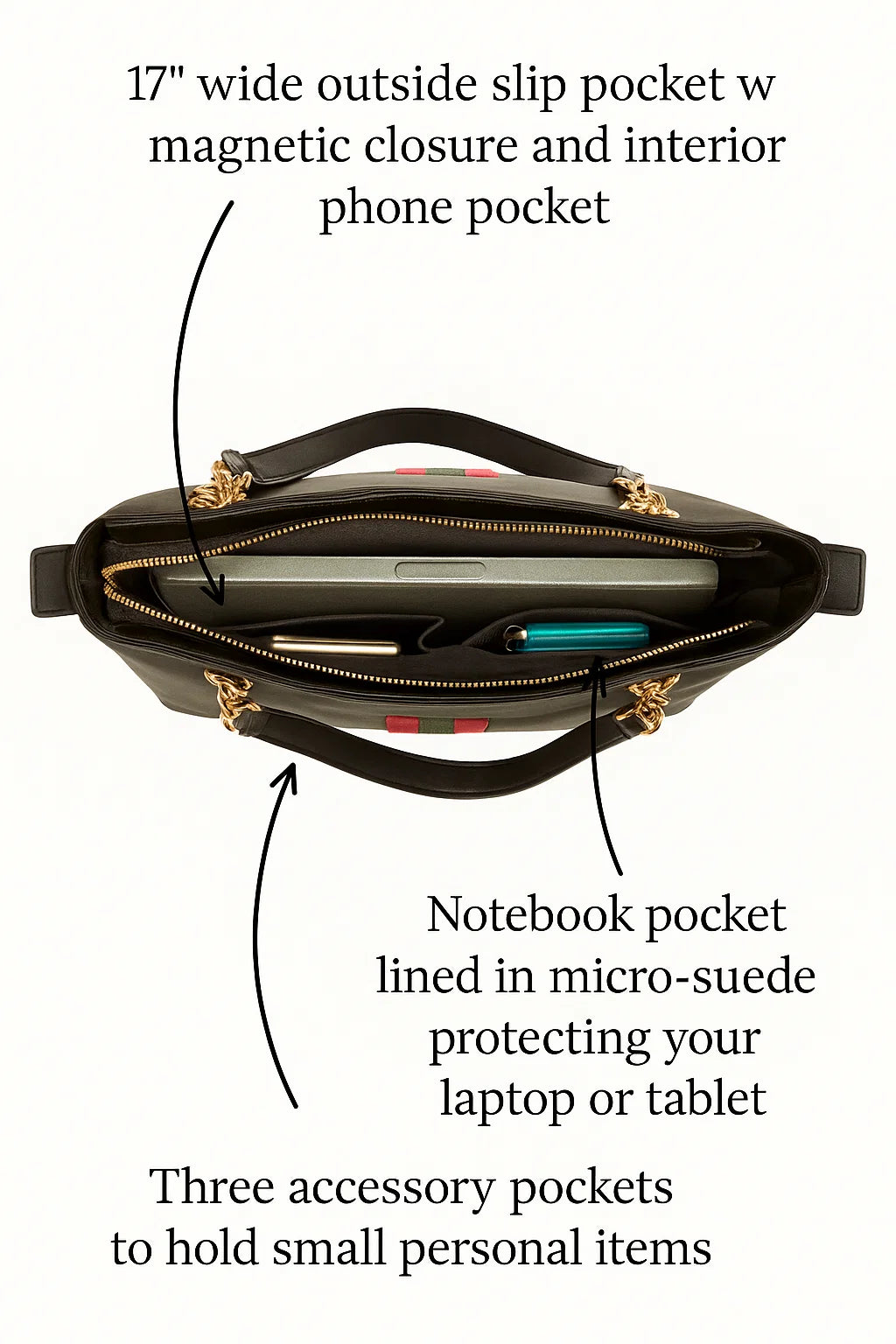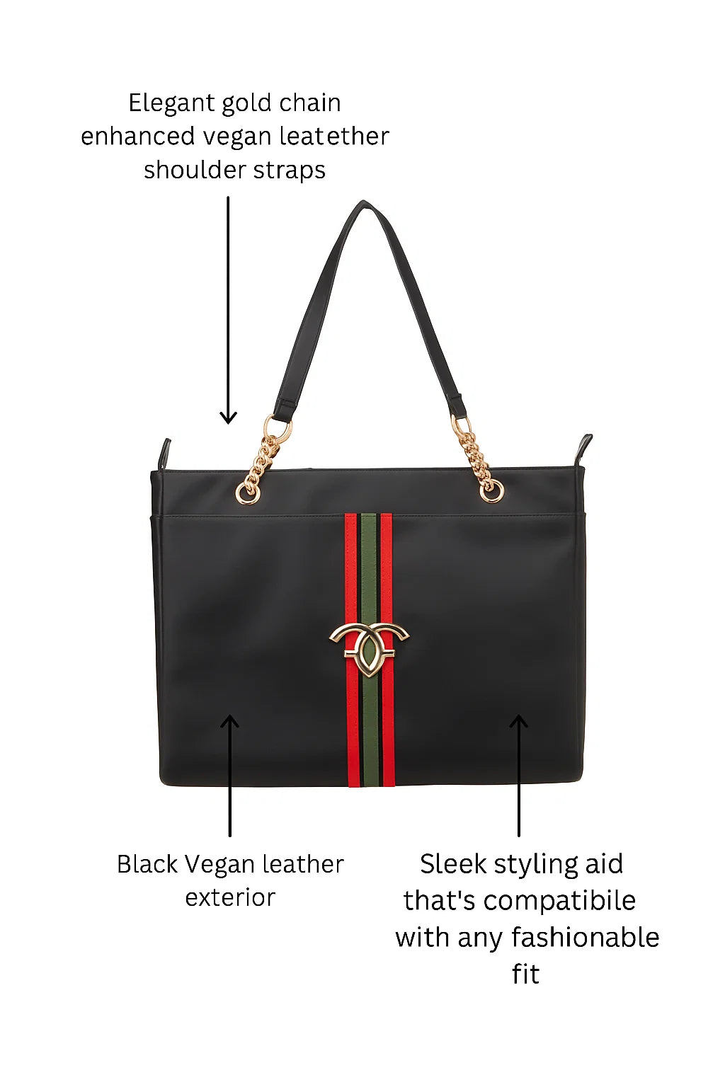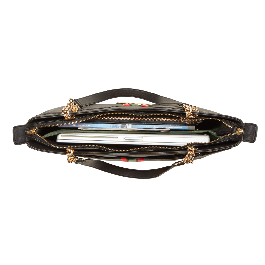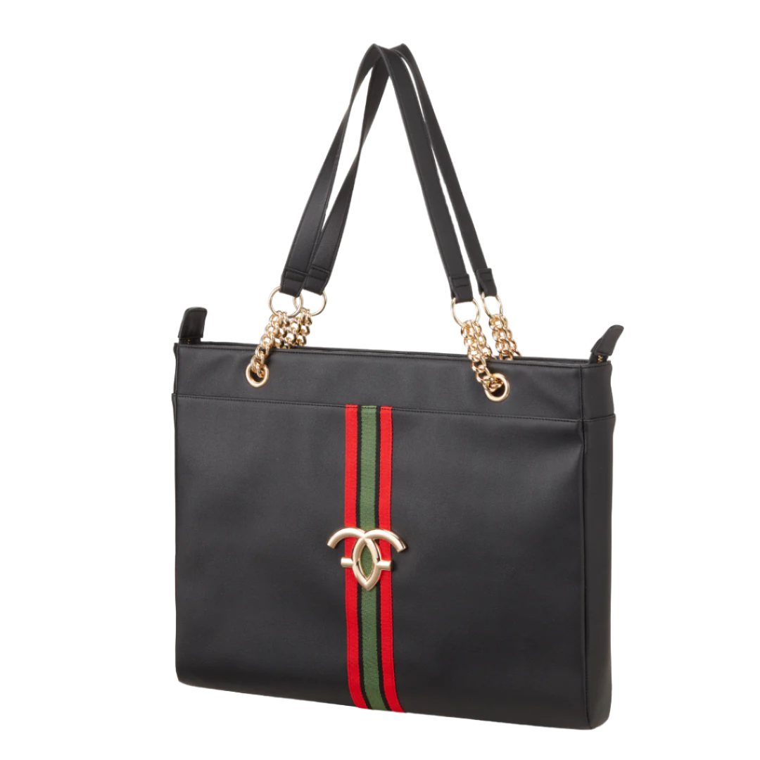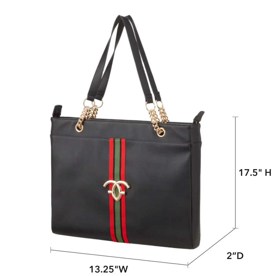 Timeless elegance personifies Francine’s Stryker zippered East/West tote. Its black vegan leather exterior, accessorized with gold chain hardware and Stryker’s signature glamour stripes, makes it a versatile, sleek styling aid that’s compatible with any fashionable fit. It embodies sophisticated simplicity, all while offering an abundance of functionality.